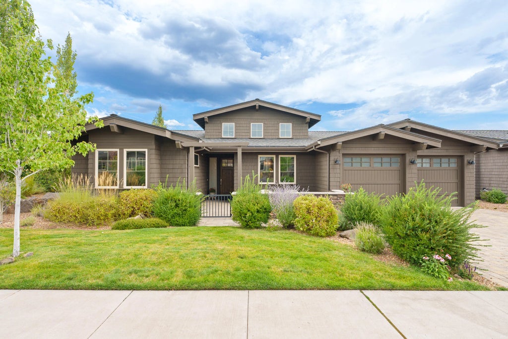 Discover exceptional living in Tetherow, where breathtaking mountain views and luxurious finishes come together seamlessly. Upon entry, you'll be greeted by soaring ceilings and an open-concept design, highlighted by expansive windows that frame views of the snow-capped peaks and the renowned Tetherow Golf Course. The main level features a spacious living area with three elegant suites and an office/den. The lower level offers two additional bedrooms, bathrooms, and a cozy family room. The chef's kitchen is a true standout, complete with Thermador appliances, a walk-in pantry, and a large island topped with granite countertops. Sliding doors in the great room and dining area open to a covered corner deck with a built-in fireplace—an ideal space to unwind while watching the sunset over the Cascades. A flawless blend of sophistication and comfort, this home will leave a lasting impression.