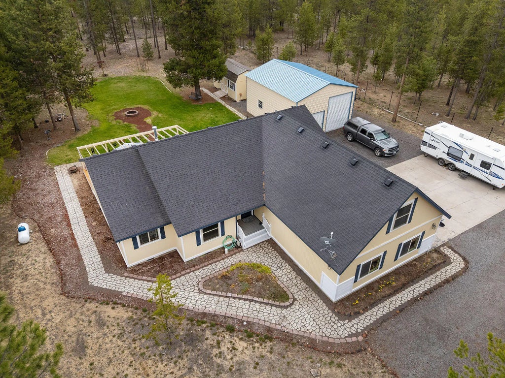 Adorable Family home 1848 sq ft 3 bedroom and a den all on the main floor, 2 bath. Recently updated with quartz counters, tile backsplash, new appliances and beautiful laminate plank flooring and inviting propane rock fireplace. A newly installed Safe Step tub. You will find solid wood doors and frames, ceiling fans, 7 newly installed windows including window shades throughout. The upstairs loft is a great get away or an option for a sitting room, game room, office or extra bedroom. Fully fenced yard with a solar controlled gate and plenty of privacy and brand new decking for entertaining or just listening to the chipmunks and birds. A wonderful 24'x30' shop with an 8'ft door and a 12'ft door making it easy to store your RV. Also included is a 12x20 shed to keep all of those items you do not want stored in your shop. Country life with access to all of the great outdoor activities and hundreds of acres of forest surrounding you, what a break this can be for your soul.