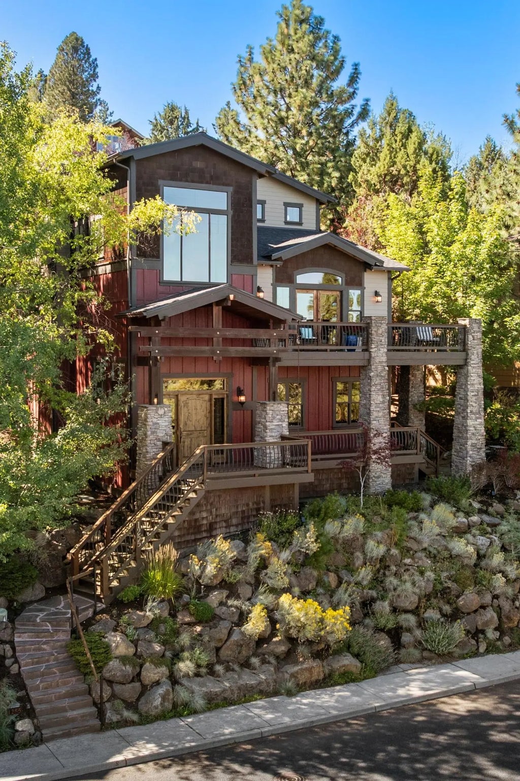 Experience refined Northwest living in this stunning 4-bedroom, 4.5-bath custom home, perfectly situated to capture breathtaking views from Mt. Jefferson to Smith Rock. Designed with timeless elegance and exceptional functionality, this home offers thoughtfully curated finishes and a spacious layout across three levels. The main floor welcomes you with a gourmet kitchen with custom cabinetry, a primary suite with access to the deck, and a sunlit living room—ideal for entertaining. Upstairs, you'll find three additional bedrooms and a versatile bonus room perfect for a playroom. The lower level provides additional space, including a dedicated office, a gym that could easily be transformed back into a home theater, a cozy family room, and two large storage rooms. Enjoy mature landscaping and low-maintenance grounds, plus a fully heated driveway leading into a 3 car garage.