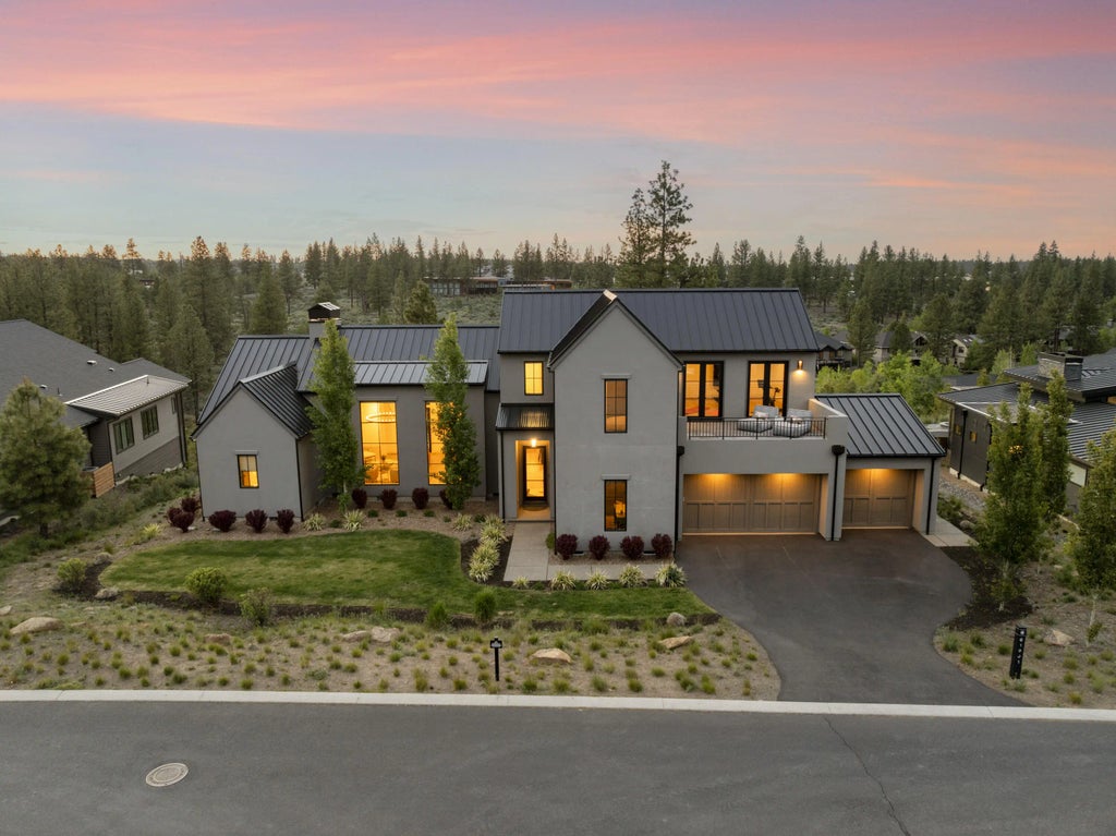 Elegant Modern Villa with nods to the serene Texas Hill country aesthetic by Structure NW in Tetherow's North 40 Crescent neighborhood. High ceilings and floor-to-ceiling windows flood the home with natural light and frame views of the landscape. Step out your door for a jog or bike up to Phil's Trail. The kitchen showcases Thermador professional series appliances, oversized island, wet bar and step-in pantry. A spacious primary retreat on main invites with freestanding soaking tub, walk-in closet, heated floors and curbless tile shower. Guest suite, office, laundry and mud room also on main level. The upper level features a large bonus room with its own patio, two bedrooms and full bathroom. Triple-car garage with epoxy coated floors and large landscaped lot. Earth Advantage Certified. Golf membership is transferable for $12,000 making it a $36,000 savings.