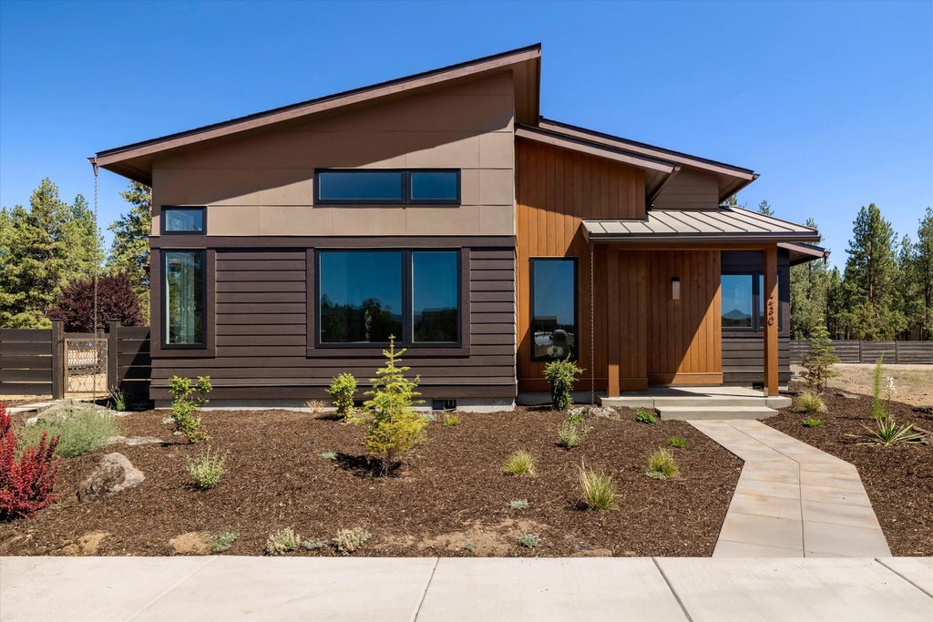Newly built mid-century beauty in Sisters! This home combines asymmetrical rooflines and contemporary style. The 3BR, 3BA model features 2 suites and boasts a floor to ceiling stone fireplace in the great room. The amazing chef's kitchen includes extensive counter space, under cabinet lighting. rollout cabinets, a 5 seated island, beverage fridge plus a walk-in pantry. There is access from the dining area to a private covered patio for outdoor dining. The primary suite has a soaking tub, curb less shower, walk-in closet with built-ins. Frameless shower glass in all baths. This 2188 sq ft home has so much to offer, including signature artisan fencing on a big 9,440 sf lot! Photos feature a different Columbia Model and are shown as an example of home. Color palette of home for sale includes white cabinets, white quartz counter tops and tile, butcher block island, warm slate look stone on fireplace and gorgeous rich LVP flooring. Seller is licensed real estate broker in Oregon