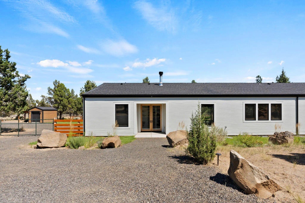Discover your very own personal oasis in Central Oregon with this spacious and thoughtfully designed, Scandinavian modern home. Situated just off Hwy 126 and 1/2 mile from the Deschutes River you will find 7 fully fenced acres of serene landscape. This single-level home is perfectly positioned East to West for a front row seat to every high desert sunrise and sunset. The expansive, open floor plan floods the home with natural light, creating a warm and inviting atmosphere and the 25 foot sliding doors offers seamless indoor-outdoor living. Designed with both comfort and style in mind, this home features four spacious bedrooms, with two offering en suite bathrooms. A true centerpiece for those valuing self-sufficiency, the property includes a private well, fruit tree orchard, and eight blooming garden boxes equipped with drip irrigation for easy, sustainable living. This home is a must see!