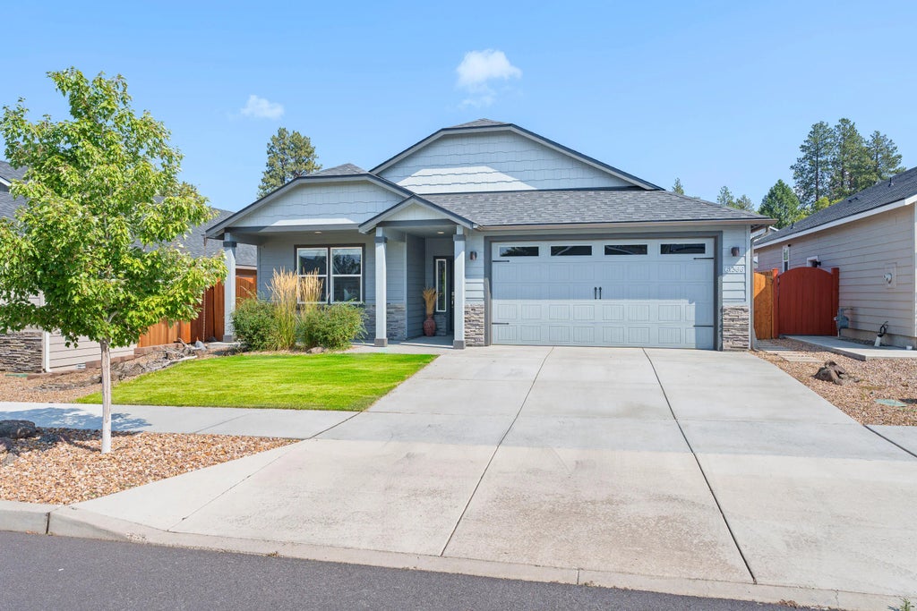 Beautifully maintained 2021-built single-level home with no HOA in a convenient SE Bend location. Light-filled with vaulted ceilings, the open great room features a gas fireplace and flows seamlessly into the kitchen with a large quartz island, breakfast bar, walk-in pantry, and abundant cabinetry. An office offers flexible space for work/hobbies and is equally functional as a third bedroom. The primary suite includes a walk-in closet, a dual vanity, soaking tub, full-height tile shower, and provides direct access to the covered backyard patio for a true retreat feel. A spacious laundry room with storage and utility sink adds practicality and organization. Relax on the covered front porch or entertain in the fully fenced backyard with a peaceful water feature and room to garden. Central air conditioning ensures year-round comfort, and a two-car garage provides ample space for vehicles or storage. This inviting home blends thoughtful design with modern comforts inside and out.